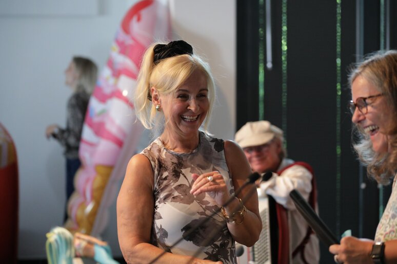 Sie verabschiedete sich von allen Gästen mit den Songs „Imagine“ und „La Paloma Ade“. Das gemeinsame Singen hatte sie sich zum Abschied gewünscht. Sie bedankte sich bei allen Wegbegleiter_innen für die vielen erfahrungsreichen gemeinsame Jahre. Mit dem Akkordeonspieler Hejo Schenkelberg „Poet der Klänge“, der die ganze Veranstaltung musikalisch begleitete, ging es dann hinaus in einen lauen Sommerabend. Bei Getränken und Häppchen wurde noch lange im Innenhof des Rudolf Schwarz Gebäudes, das Ute Antonia Lammel sehr am Herzen liegt, gefeiert.