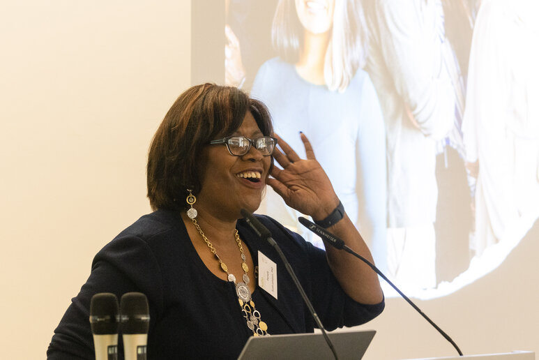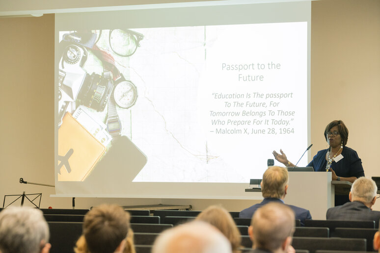 Anschließend nahm Pamela E. Scott-Johnson, Prorektorin und Vizepräsidentin des Spelman Colleges in Atlanta, die Teilnehmenden mit auf eine Reise durch die US-Geschichte, um den Weg des Landes hin zu einer integrativen und transformativen Gesellschaft aufzuzeigen. Mit Blick auf die Rassentrennung in den USA begann sie bei Präsident John F. Kennedy, der 1961 das erste Gesetz verabschiedete, wonach sich die Regierung zu Chancengleichheit und gleichem Wahlrecht für alle verpflichtete. Sie sagte: „Wir sind privilegiert, darüber nachzudenken, dass es einen positiven Wandel gibt“, so Scott-Johnson, „wir tolerieren diesen Unsinn nicht länger.“ Sie griff das anschauliche Bild vom Zauberer Gandalf aus „Herr der Ringe“ auf, der sie gerne wäre, als dieser dem Ungeheuer Balrog auf der Brücke von Kazad-dum zuruft: „Du kannst nicht vorbei!“ Schließlich endete Scott-Johnsons Reise mit einem Handlungsaufruf an alle: „Achten Sie auf Veränderungen in Ihren akademischen Führungsgremien! Legen Sie fest, wie Sie in Ihren Gemeinschaften etwas bewirken wollen! Lassen Sie nicht zu, dass unsere Unterschiede in Bezug auf Rasse, Religion, Land oder Herkunft uns daran hindern, die Menschlichkeit in anderen zu sehen!“