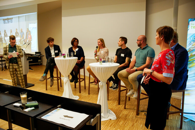 In der anschließenden Diskussion, die wieder das Moderatorenteam Verlinden-Laukötter moderierte, kamen auch drei Kölner Studierende der katho zu Wort. Nina Lorenz (Gesundheitswesen), Julian Bickmann (Sozialwesen) und Tobias Tirtey (Gesundheitswesen) berichteten von ihren Erfahrungen mit der digitalen Lehre in der Corona-Pandemie und den Vor- und Nachteilen sowie den Beteiligungsmöglichkeiten an der katho. Prorektor Klein machte Mut, die Fachbereichsratssitzungen auch von studentischer Seite als Kommunikationsschnittstelle zu nutzen: „Seien Sie mutig und gestalten Sie in unseren Gremien die Hochschule mit, um die Transformation voranzubringen!“ Klein hob außerdem auf die Bedeutung der Hochschulbibliotheken als Herz des Wissens ab. Könnten sie als Lerninseln und neue Begegnungsorte eine neue Form des Austauschs über die Hochschulen hinaus ermöglichen? Die beiden Keynote-Speaker_innen ergänzten die Diskussion mit ihren Erfahrungen aus ihren Hochschulen.