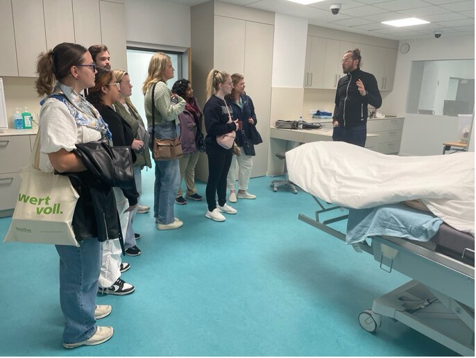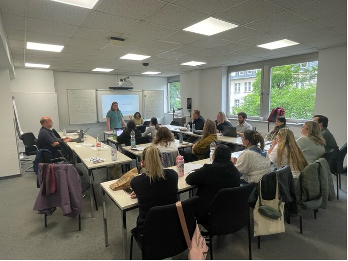 Anschließend besuchte die Gruppe den Fachbereich Sozialwesen am Standort Köln. Dort nahm sie am Seminar „Social Segregation and Community Organizing“ teil, das durch die Professorinnen Zabotka und Ragudaran sowie durch Prof. Dr. Werner Schönig und Prof. Sebsastian Wen von der katho geleitet wurde. Das Seminar, das bereits im Mai in hybrid per WebEx begann, konnte nun vor Ort gemeinsam erfolgreich zu Ende geführt werden. Es war am Standort Köln in den BASA sowie in das englischsprachige Studienprogramm „Social Work and Exclusion“ eingebettet und brachte damit Studierende aus den USA, der Ukraine, der Türkei, Deutschland und Litauen zusammen, um das Thema in international vergleichender Perspektive zu durchdringen. Zudem wurde die Gruppe von der Rektorin Prof.in Dr.in Barbara Schermaier-Stöckl, dem Kanzler Bernward Robrecht und der Leiterin des International Office Helene Hofmann empfangen. Schließlich besuchte die US-Gruppe gemeinsam mit Prof. Dr. Werner Schönig und Prof. Dr. Sebastian Wen das Skills Lab am Standort Köln, das durch Prof. Dr. Ulrich Frischknecht vorgestellt wurde, sowie verschiedene Einrichtungen der Sozialen Arbeit, etwa den Drogenkonsumraum am Neumarkt, die Alte Feuerwache und die Bahnhofsmission am Kölner Hauptbahnhof, die durch die katho Studentin Franziska Bassenge vorgestellt wurde.