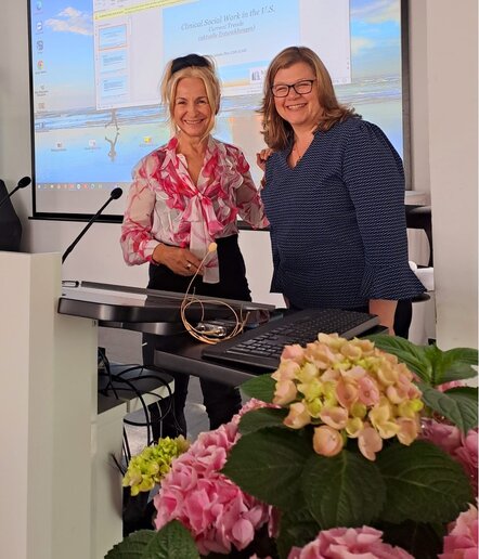 Zunächst führte es den Besuch nach Aachen, wo die Gruppe vom 6. bis 7. Juni am 13. Kongress der Klinischen Sozialarbeit mit dem Titel „Empowerment und social belonging. Therapeutical and developmental approaches in Clinical Social Work and Social Therapy“ teilnahm. Dabei sprach Professorin Zabotka – mehrfach lizensierte Sozialarbeiterin in Clinical Social Work (LCSW), Alkohol- und Drogenberaterin (LCADC) und Professorin für Soziale Arbeit an der Monmouth University – in einer Keynote über das Thema „Current Situation of Clinical Social Work in the U.S.“. Zabotka gewährte anschauliche Einblicke in die aktuelle Situation der Praxis und Finanzierung der Klinischen Sozialarbeit in den USA. Mit ihrem Beitrag und in dem sich anschließenden internationalen Erfahrungsaustausch der Masterstudierenden aus den USA, Österreich und verschiedenen Hochschulen in Deutschland konnte die langjährig bestehende Kooperation der katho mit der Monmouth University inhaltlich vertieft und die Vernetzung zwischen dem akademischen Nachwuchs in den deutschsprachigen europäischen Ländern und dem „Mutterland“ der Klinischen Sozialen Arbeit weiter ausgebaut werden.