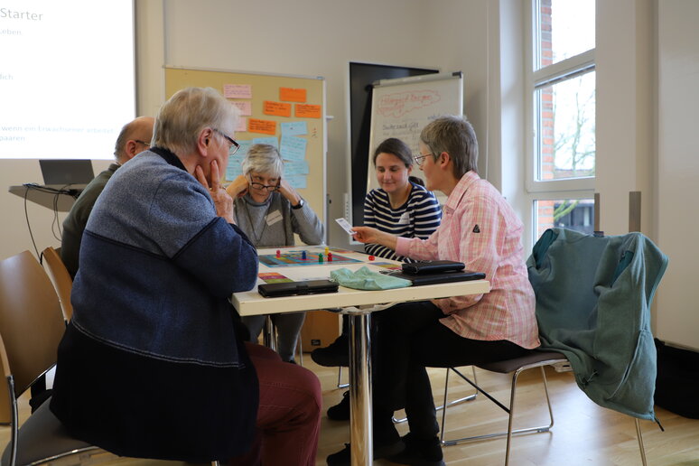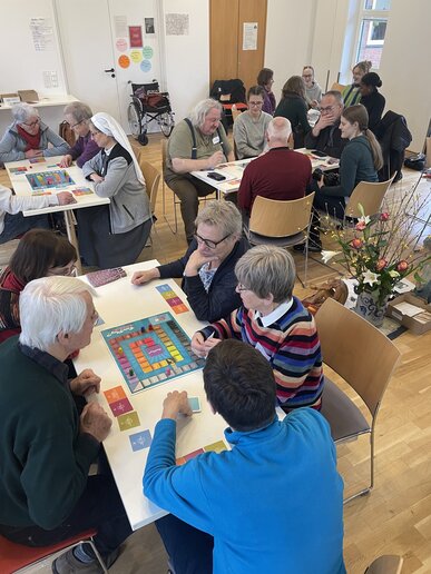 Im Rahmen des 34. Kontaktseminars Option für die Armen an der katho am Standort Münster haben Schwester Sieglinde Ruthner, Mitglied der Caritas Socialis, einer geistlichen Gemeinschaft von Frauen in der katholischen Kirche, und Sozialarbeiterin Kristina Hafner am 6. Februar 2024 erstmals das Spiel in Deutschland vorgestellt. Die 45 Teilnehmenden des Seminars – Ordensleute, Fachkräfte aus sozialen und pastoralen Handlungsfeldern und Studierende der katho – haben das Spiel ausprobiert und reflektiert. „Ja, das Spiel macht was mit einem“, war der Haupttenor. Denn es geht auch um ein Rollenspiel und nicht nur um „Würfelglück“. Sich in diese Rollen hineinzuversetzen und sich dafür als ganze Gruppe ausreichend Zeit zu nehmen, war für viele die wichtigste Erfahrung. Zum Beispiel für Schwester Renate Basler aus Tutzing: „Mein Tipp nach der Erfahrung des Spiels heißt: Nach dem Ziehen der ‚Familienkarten‘ sich selber in die Situation einfühlen und sie der Gruppe vorstellen – in Ruhe, damit alle sich in jede*n Teilnehmer*in einfühlen können. Dafür ausführlich Zeit lassen! Und nach dem Spiel Raum lassen, dass alle reihum erzählen, wie es ihnen ging.“ Dean Loy, Sozialarbeiter bei einer Beratungsstelle für von Armut betroffene Familien in Münster, hat als Tipp für weitere Spielergruppen: „Nehmt euch Zeit, über aufkommende Gefühle zu sprechen. Auch kleine Launen, Langeweile, Neid, Freude usw. Es lohnt sich, genau darauf zu schauen. Und: Nehmt euch Zeit, zu schauen, welche Auswirkungen die Karten für alle haben, nicht nur für die Person, die sie zieht.“ Anna Isenberg, Sozialarbeiterin beim Caritasverband für die Stadt Essen, hat diese Erfahrung gemacht: „Während des Spiels kann aus der Gruppe der Impuls kommen, die Spielregeln zu verändern, weil die Ereigniskarten als ungerecht erlebt werden und die Spielfreude bei allen getrübt wird. Beim nochmaligen Spielen kann ich mir vorstellen, diesem Impuls Raum zu geben.“