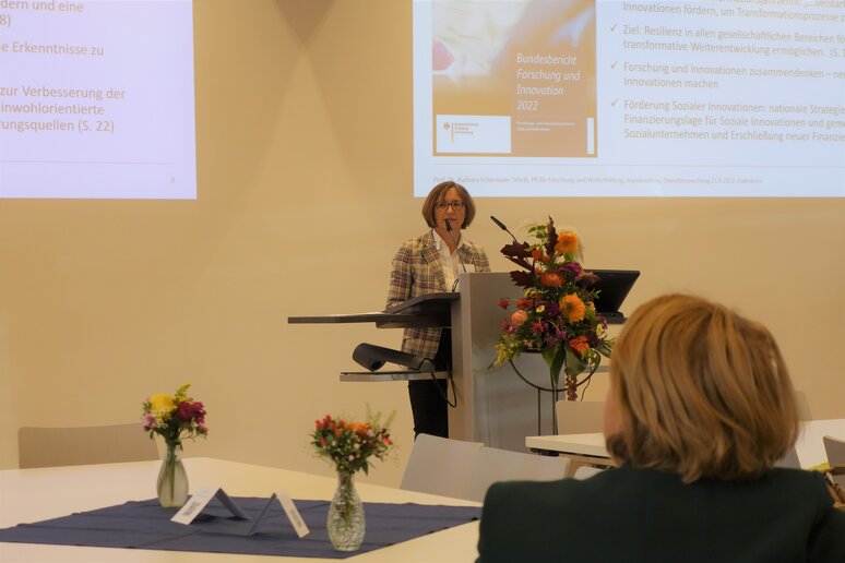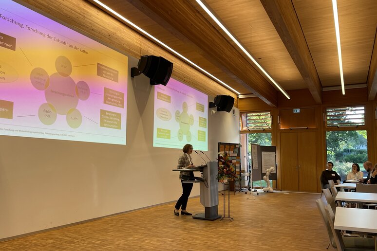 In einem eindrucksvollen Impulsvortrag zur Zukunft der Forschung folgte Prorektorin Barbara Schermaier-Stöckl. Sie erklärte, wie die guten Forschungsbedingungen an der katho zukünftig abgesichert werden könnten – fernab von Drittmitteln, die seit 2019 von über zwei Millionen Euro auf eine halbe Million im Jahr 2022 zurückgegangen sind. Zurecht forderten die HAWs eine Stärkung ihrer Position gegenüber den Universitäten. Auch wenn die Bundesregierung ausdrücklich mehr technologische und soziale Innovationen ermöglichen möchte, würden die Anforderungen, an Fördertöpfe für Soziale Arbeit, Pflege- und Gesundheitswissenschaften zu kommen, immer höher. Deshalb gelte es, das Forschungsprofil zu stärken, Forschungsaktivitäten und den wissenschaftlichen Nachwuchs zu fördern, den Forschungssupport auszubauen sowie eine Ermöglichungskultur und weitere Förderinstrumente zu etablieren, sagte die Prorektorin. Dazu sollen die Ergebnisse der passgenauen Workshops der Dienstbesprechung beitragen.