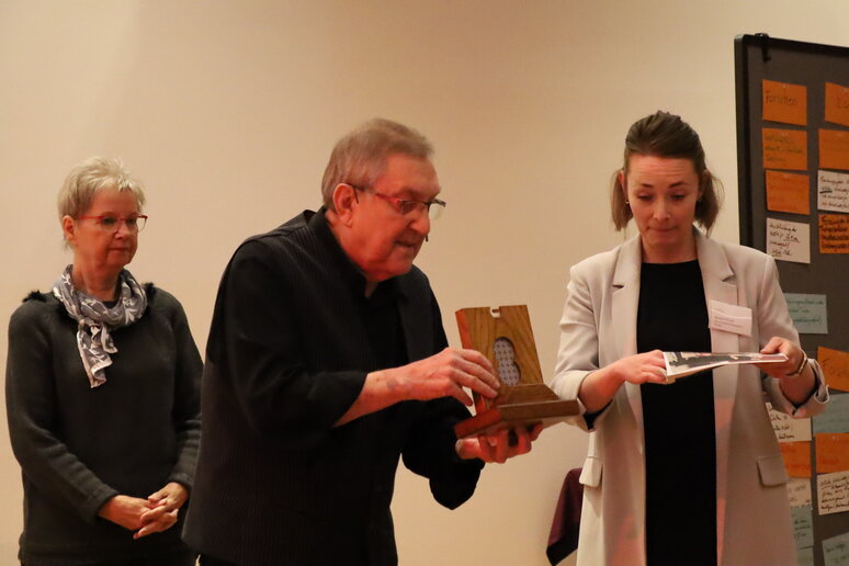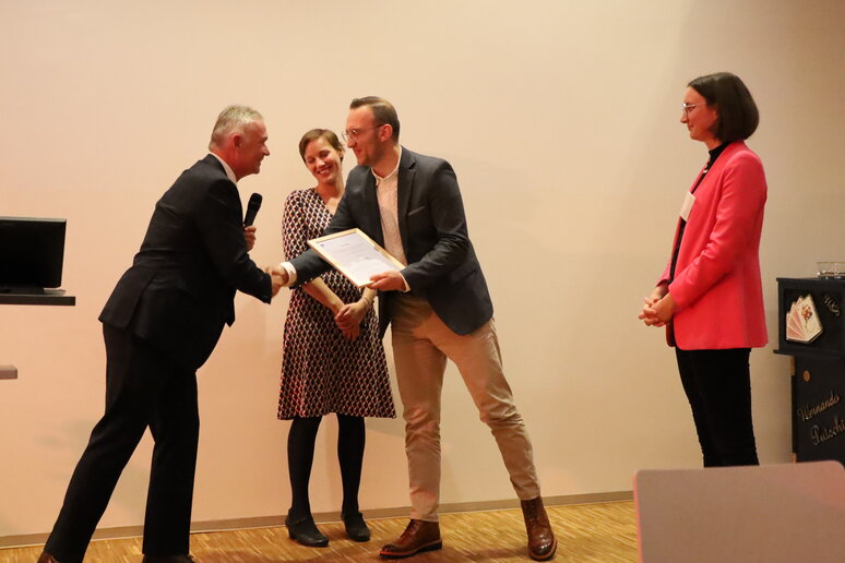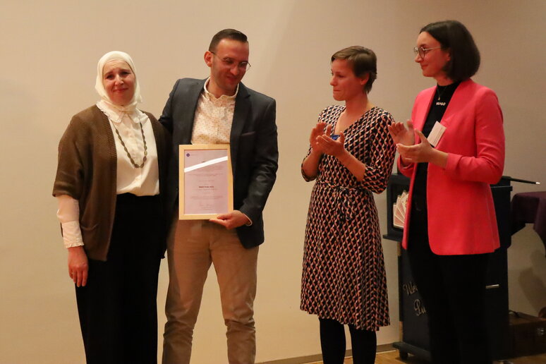 Der Höhepunkt des Abendprogramms war die Verleihung des DAAD-Preises 2022 an den Studierenden Ahmad Sabsabe, den Rektor Hobelsberger als „Mutmacher für alle junge Menschen, die sich aus dem Nichts etwas aufbauen müssen“ würdigte. Nachdem Ahmad Sabsabe in seiner Heimat unter dem Assad-Regime ein Jahr im Gefängnis saß, gelangen ihm und seiner politisch aktiven Familie die Flucht von Homs nach Deutschland. 2018 startete er im Rahmen des Programms für Geflüchtete „Ready, Steady, Go“ sein Bachelor-Studium der Sozialen Arbeit an der katho in Köln. Schnell fiel der 28-Jährige den Dozierenden als schlauer Kopf auf, seine Leistungen waren stets herausragend – trotz der für ihn neuen Sprache Deutsch. Darüber hinaus engagiert sich Sabsabe in zahlreichen bundesweiten Ehrenämtern und ist für geflüchtete Menschen aktiv. An der katho ist Sabsabe in der Arbeitsgruppe diskriminierungskritische und diversitätssensible Hochschule (AG DDH) sowie in dem Arbeitskreis Europa tätig. Im Rahmen seines Zusatzzertifikats „Soziale Arbeit in der Migrationsgesellschaft“ war er Mentor für BASA-Studierende aus dem Projekt „Ready, Steady, Go“. Auch in verschiedene Gremien der katho wurde Sabsabe gewählt und er engagierte sich im Fachbereichsrat, Gesamtfachbereichsrat sowie im Senat. Für diese herausragenden Leistungen und das außerordentliche Engagement überreichte der Rektor Ahmad Sabsabe gemeinsam mit Prof.in Dr.in Karla Verlinden und Prof.in Dr.in Isabelle-Christine Panreck, die ihn für diese Auszeichnung vorgeschlagen hatte, mit Standing Ovations des anwesenden Publikums die Würdigung. Auch Sabsabes Mutter kam auf die Bühne. Alle Gäste waren nach der emotionalen Laudatio sichtlich gerührt.