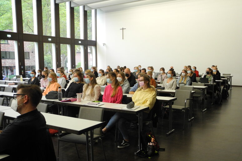 Die Studierenden der Heilpädagogik durften bei der Einführungsveranstaltung am Montagmorgen unter Einhaltung der Hygieneregeln und Kontrolle der 3G-Nachweise ihr Studium in Präsenz an der Hochschule beginnen. Dort wurden sie von Prof. Dr. Heinrich Greving in das diesjährige Thema „Teilhabe von Menschen mit Behinderung“ eingeführt. Nach der anschließenden Begrüßung durch die Lehrenden der Heilpädagogik und der Einführung in die Idee des forschenden Lernens in den Studieneingangsprojekten durch die Modulbeauftragte Prof. Dr. Barbara Ortland wurde es konkret: Aus fünf verschiedenen Schwerpunkten „Teilhabe und…bspw. Jugendhilfe / Kommunikation / Gesundheit / Arbeit / Bildung…“ konnten die Studierenden wählen. Da fiel es manchem schwer zu entscheiden, ob lieber ein inklusives Gebärdenchorprojekt forschend erkundet werden sollte oder die Zufriedenheit der Beschäftigten in einer Werkstatt für Menschen mit Behinderungen in Leichter Sprache erfragt wird. Welche Projekte letztlich dann auch umgesetzt werden – es wird für die neuen Studierenden und die Kolleg_innen in der Praxis sicher wieder eine gute gemeinsame Erfahrung gelingender und gegenseitig bereichernder Kooperation werden.