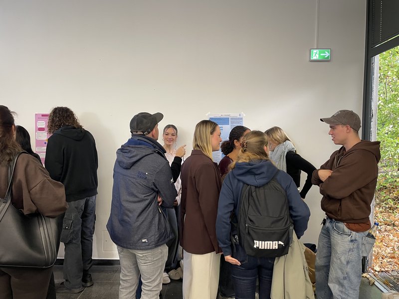 Kurz nach 10.00 Uhr ging es dann los, Musik wurde eingeschaltet und die Studierenden strömten in die Aula, suchten IHR Poster und versammelten sich davor. Prof. Dr. Dominik Farrenberg, Studiengangsleitung im Regelstudiengang, hielt eine kurze Ansprache, resümierte die ersten fünf Wochen der Neu-Studierenden seit ihrem Ankommen Mitte September an der Hochschule und erklärte noch einmal das Vorgehen des anstehenden Poster-Walks, der sodann begann.