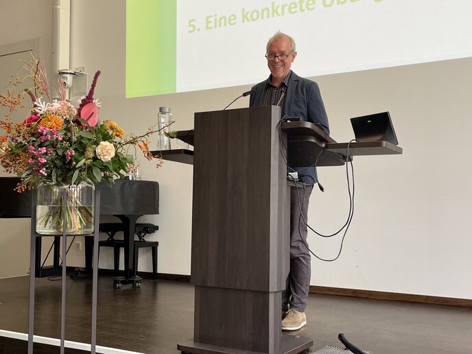 Als Festredner sprach Prof. Dr. Norbert Frieters-Reermann von der katho am Standort Aachen. In seinem Vortrag „Für ein Leben von morgen. Klimagerechtigkeit und Nachhaltigkeit als Herausforderungen für soziale Berufe“ zeigte er auf, wie soziale Professionen sich stärker ökologisch-reflexiv weiterentwickeln müssen. Neben dem analytischen Verstehen der Klimakrise brauche es Basis-Kompetenzen, „um gesund und handlungsfähig zu bleiben“. Dazu zähle auch, achtsam mit Emotionen wie Trauer und Wut umzugehen.