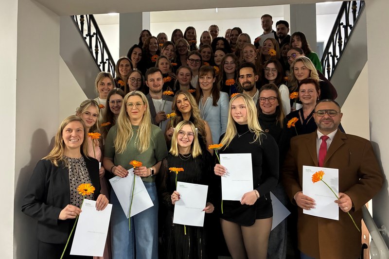 "Blumen in die Höhe": Glückliche Absolvent_innen beim Abschlussgruppenfoto vor dem Haupteingang der katho am Standort Paderborn. (Foto: katho/LRN)