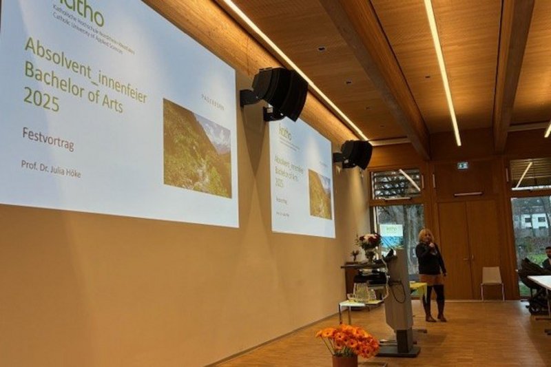50 Absolvent_innen feierten am 12. Dezember 2025 im Rahmen der Bachelorabschlussfeier des Fachbereichs Sozialwesen ihren erworbenen „Bachelor of Arts“ an der katho am Standort Paderborn. Dekan Prof. Dr. Patrick Isele begrüßte die 190 Gäste im Audimax und freute sich über die ausgelassene und festliche Stimmung aller Beteiligten. Die im Dezember angesetzte Feier hatte einen ganz besonderen Charme – spürbar war nicht nur die Festlichkeit aufgrund der stattfindenden Abschlussfeier, sondern auch die vorweihnachtliche Stimmung und der baldige Jahresabschluss lies die Gäste innehalten und auf das zurückliegende Jahr 2025 in besonderer Weise zurückblicken.