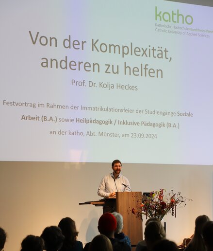 Mit seinem Festvortrag „Von der Komplexität, anderen zu helfen“ stimmte Prof. Dr. Kolja Heckes die Erstsemester auf das kommende Studium ein. An verschiedenen Beispielen zeigte er auf, welch anspruchsvolles Unterfangen professionelle Hilfe ist. „Wir lassen Sie mit diesen Komplexitäten nicht allein“, so Heckes. Alle Module der Studiengänge seien darauf ausgerichtet, eine reflexive Professionalität zu erreichen.
