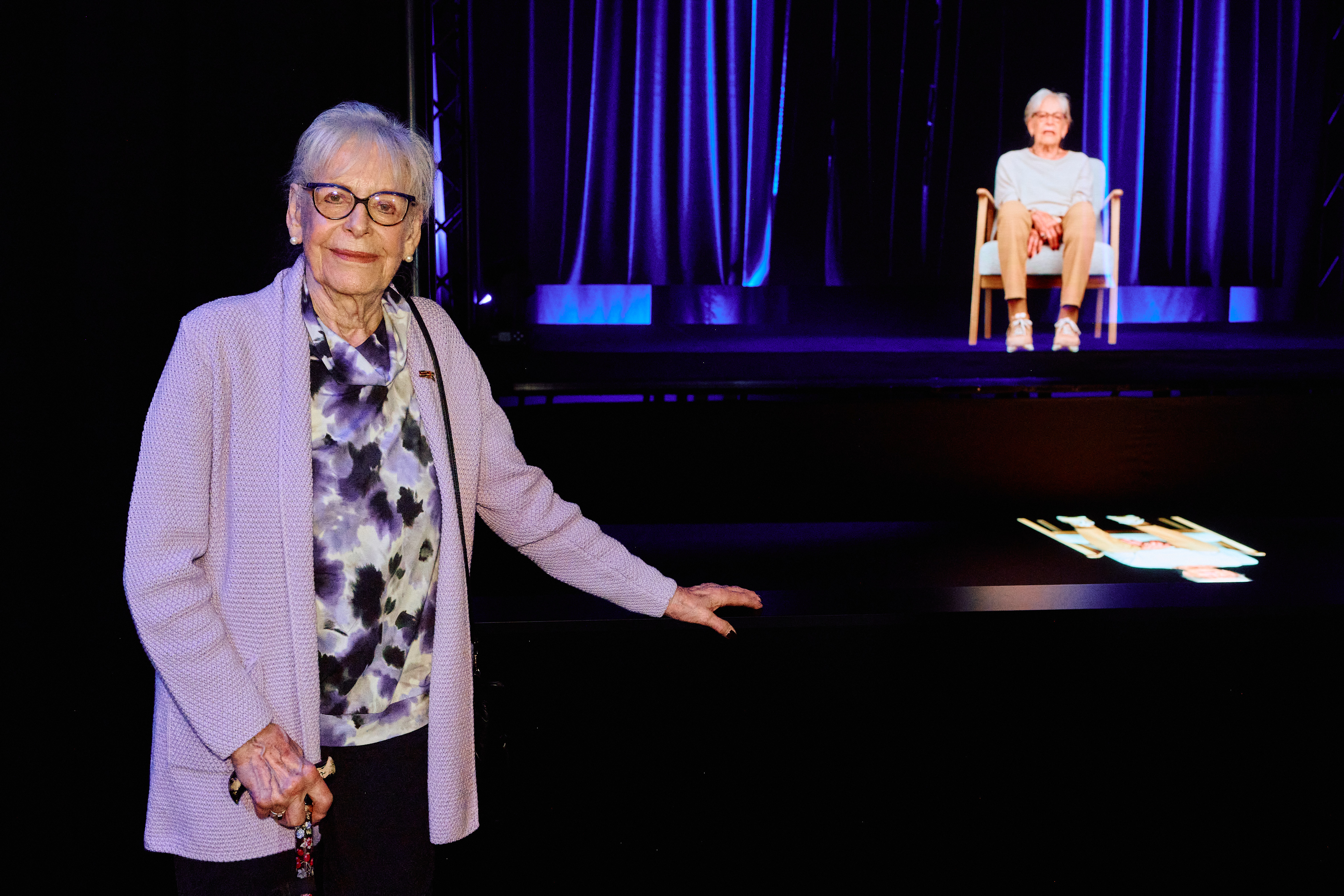 Die Holocaust-Überlebende Eva Weyl vor ihrem Hologramm: Sie wurde vorab von Studierenden der TU Dortmund für Holo-Voices interviewt. (Foto: MKW NRW/Bernd Thissen)