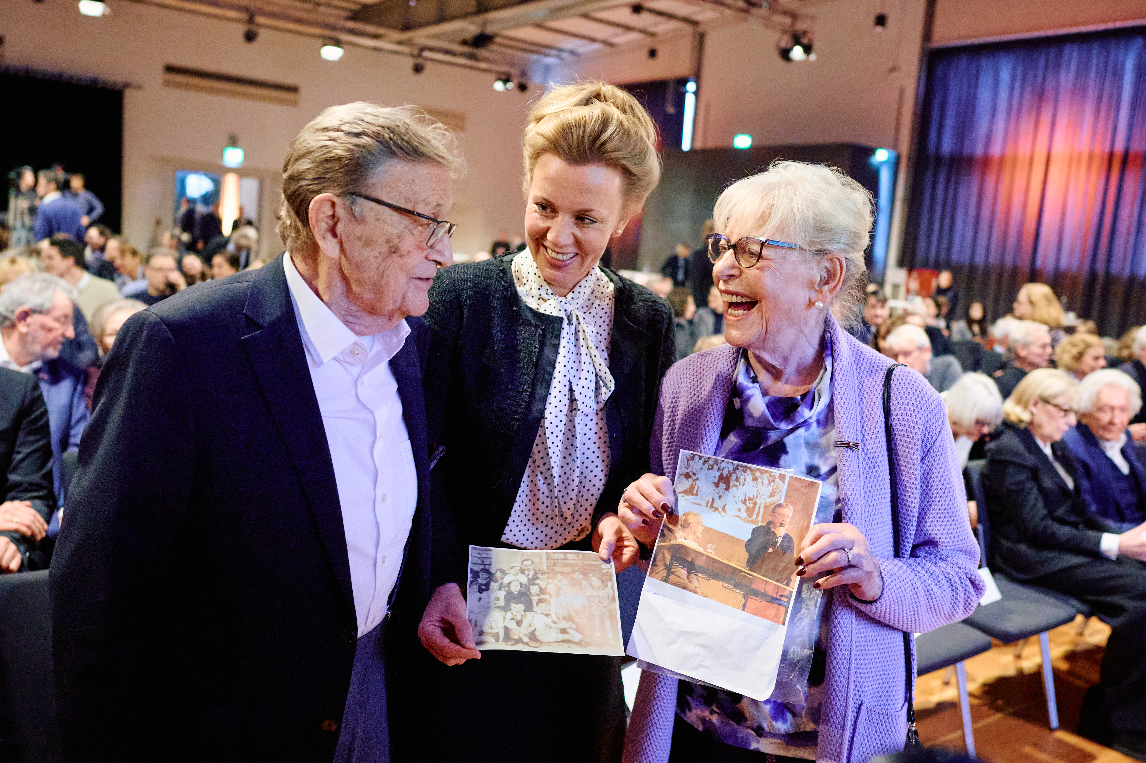 Ina Brandes, Ministerin für Kultur und Wissenschaft des Landes Nordrhein-Westfalen (Mitte), im Gespräch mit anwesenden Holocaust-Überlebenden. (Foto: MKW NRW/Lars Berg)