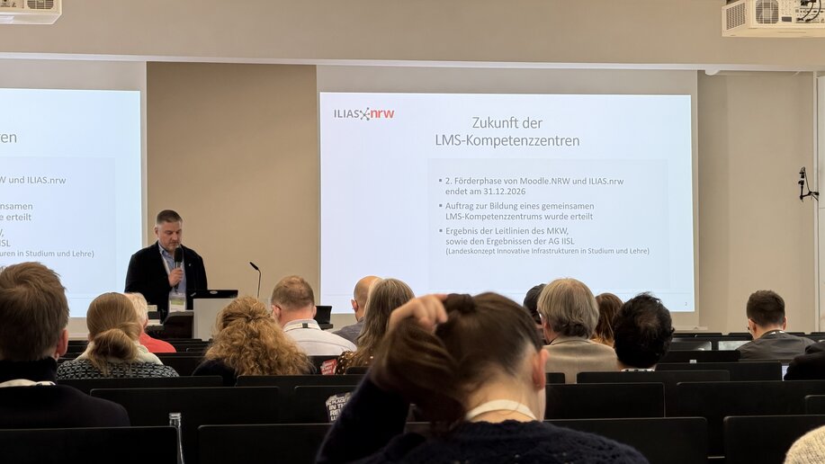 Den Auftakt bildete am ersten Tag das ILIAS.NRW-Communitytreffen (ein Projekt der DH.NRW) mit rund 60 Teilnehmenden. Im Fokus stand der landesweite Austausch zu Einsatz, Weiterentwicklung und strategischer Bedeutung von ILIAS an Hochschulen in Nordrhein-Westfalen.