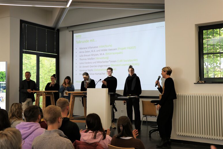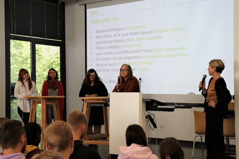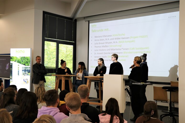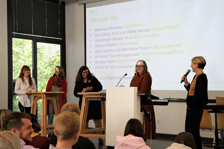 Um den Studierenden die Mitarbeiterinnen und Mitarbeiter der katho Aachen einmal persönlich bekannt zu machen, berief Petra Ganß, Professorin für Soziale Arbeit und Organisatorin der Ersti-Woche, eine kleine Talk-Runde auf der Bühne der Aula ein mit Vertreter_innen des AStA und des StuPa, des wissenschaftlichen Mittelbaus, der IT, des Dekanatssekretariats und anderen Mitarbeiter_innen der katho. "Was macht für euch die katho so besonders", lautete die Eingangsfrage, und die Studierendenvertreter_innen antworteten prompt: "Dass wir hier zusammenhalten". Klein sei die katho zwar, im Verhältnis zu den bekannten großen Hochschulen der Umgebung, aber gerade das mache den Reiz aus: Eine persönliche, familiäre Atmosphäre und Gespräche mit Lehrenden auf Augenhöhe.