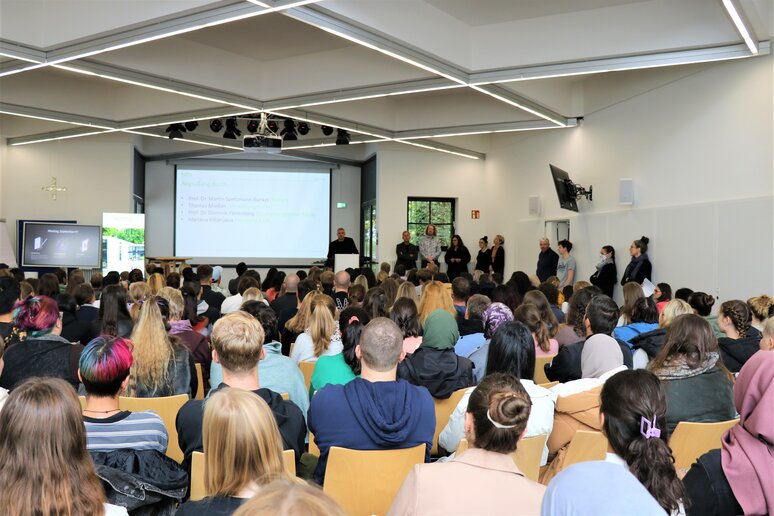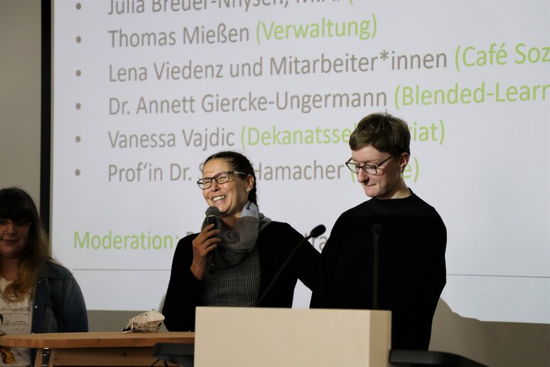 Mit Herman Hesses Ausspruch "In jedem Anfang wohnt ein Zauber inne" stellten sich im Anschluss Professorin Silvia Hamacher und Professor Dominik Farrenberg als neue Prodekanin und neuer Prodekan vor. Beide beginnen ihre Arbeit - gemeinsame mit Dekan Prof. Martin Spetsmann-Kunkel - voraussichtlich im Frühjahr nächsten Jahres; Prof. Dominik Farrenberg wird dabei auch die Studiengangsleitung für den Studiengang Soziale Arbeit B.A. übernehmen. "Ich bitte Sie", wendet er sich an die Studierenden, "bleiben Sie nicht auf Distanz. Gehen Sie auf Tuchfühlung mit dieser für Sie neuen Welt und gestatten Sie sich, 'wirklich'" zu studieren - seien Sie sich das wert."