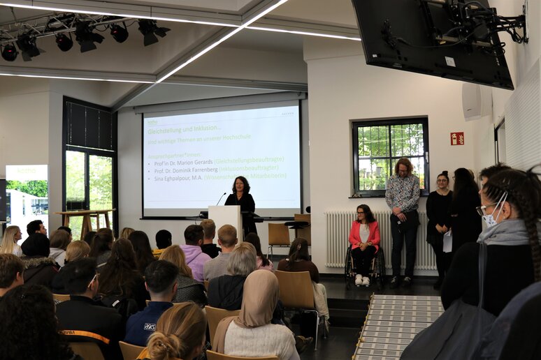 Professorin Marion Gerards, Gleichstellungsbeauftragte am Standort Aachen, sowie der Aachener Inklusionsbeauftragte Professor Dominik Farrenberg stellten im Anschluss die unterschiedlichen Beratungsangebote der katho Aachen für Studierende vor: Ob mit Kindern, in Pflegeverantwortung, in Fragen der Gleichstellung, Barrierefreiheit oder auch bei Diskriminierungserfahrungen: Die Hochschule biete durch ihr Netzwerk an Beratungs- und Unterstützung für jede_n die Möglichkeit, ins Gespräch zu kommen und Lösungen zu erarbeiten - offen und doch vertraulich.