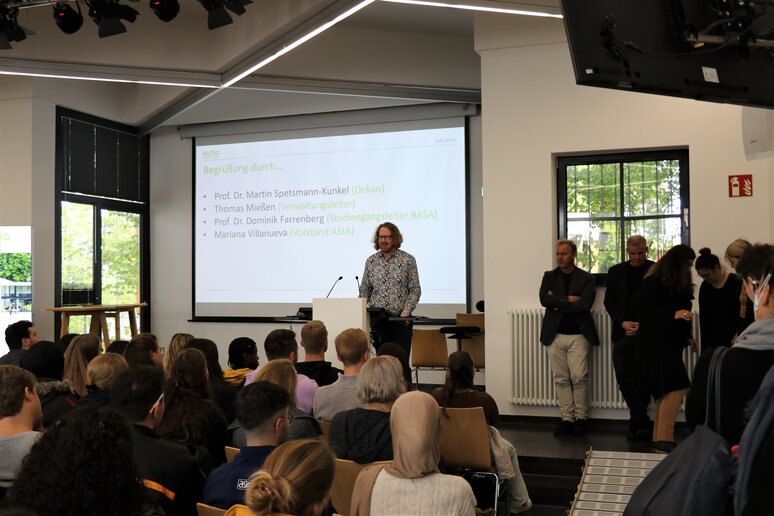 Zu Anfang wurden die Neulinge jedoch erst einmal herzlich in der Aula der katho Aachen von Dekan Prof. Dr. Martin Spetsmann-Kunkel begrüßt, der vor allem die große Verantwortung der zukünftigen Sozialarbeiter_innen und Sozialpädagog_innen ansprach: "Soziale Arbeit", betonte dieser, habe "immer das Ziel, sich für eine gerechtere Gesellschaft einzusetzen". Dies sei eine Verantwortung, die von immens hohem Wert sei, die aber auch persönlich gewinnbringend und sinnstiftend sei: "Ich kann mir keine schönere Aufgabe vorstellen".