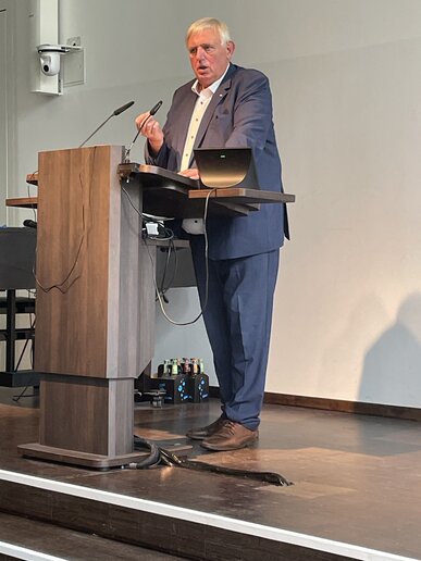 Auf dem Podium diskutierten anschließend fünf Studierende mit dem Minister. Felix Daniel, Lara Hisker, Henrik Jahn, Bastian Linnemann und Lennart Raulf ging es u.a. um ihre Erfahrungen mit sog. Ergänzungskräften, um den Beitrag des Landes beim Ausbau von Ausbildungs- und Studienplätzen und die Wertschätzung sozialer Berufe. Bei den Fragen aus dem Publikum bestätigte Laumann die positive Wirkung der seit März geltenden zweiten Stufe des Fachkräfteeinwanderungsgesetzes und kritisierte das Arbeitsverbot für Asylbewerber. „Je länger jemand von Transferleistungen lebt, umso schwieriger wird der Übergang in den Arbeitsmarkt“, so Laumann. Dass Löhne über Tarifverträge ausgehandelt werden, sei der richtige Weg. Die Landespolitik müsse dafür sorgen, dass die Träger in der Lage sind, die Löhne zu zahlen. Das Bürgergeld dagegen könne so nicht bleiben, da müssten die Erfahrungen der Jobcenter und die Akzeptanz auf Seiten derer, die das Bürgergeld finanzieren, stärker berücksichtigt werden. Laumann bestätigte die Einschätzung einer Studentin der Heilpädagogik/Inklusiven Pädagogik, dass in den letzten Jahren die Heilpädagogik „mehrheitlich abgewertet“ worden sei – sehr zum Schaden der Eingliederungshilfe. „Die Heilpädagogik ist einer unserer Ankerberufe“, eine stärkere Sichtbarkeit müsste über die Einrichtungen erfolgen. Auch über Projektstellen wurde gesprochen. Für die Träger ist die Befristung von (Modell-) Projekten problematisch, da befristet Beschäftigte sich manchmal schnell wegbewerben, wie ein Praxisvertreter berichtete. Die Problematik war dem Minister bewusst. Der Europäische Sozialfonds würde Projekte jedoch nur befristet finanzieren; er könne durch Landesgeld nicht ersetzt werden.