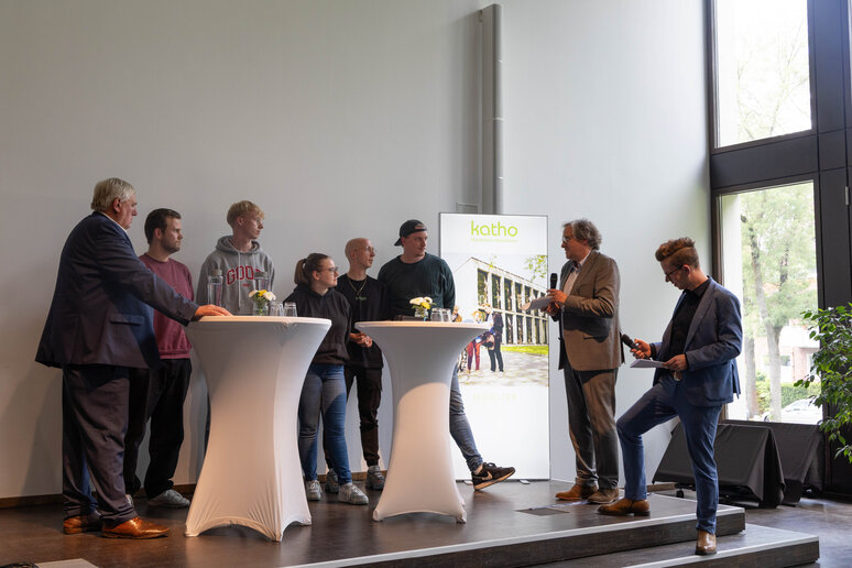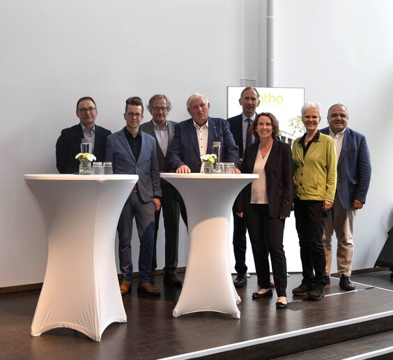 Prof. Dr. Georg Albers, Prof. Dr. Sebastian Laukötter, Prof. Dr. Jörg Rövekamp-Wattendorf, Minister Karl-Josef Laumann, Kanzler Bernward Robrecht, Dekanin Prof.in Dr. Anja Kannegießer, Prorektorin Prof.in Dr. Barbara Ortland, Dompropst und Vorsitzender des Verwaltungsrates Hans-Bernd Köppen (v.l.n.r.)