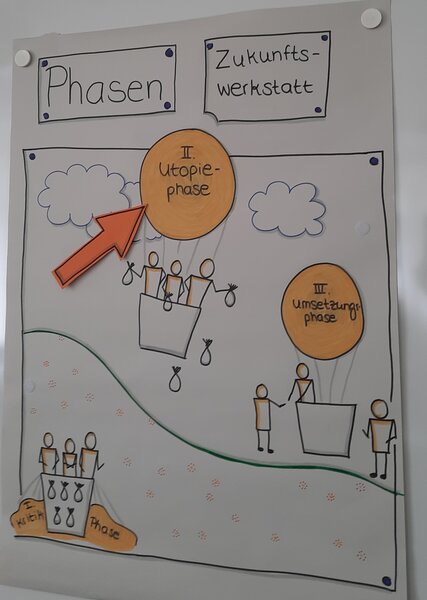 In der engen Verbindung von Studium an der Hochschule und wöchentlicher Praxistätigkeit führten die Studierenden eine empirische Analyse der Entwicklung und der Herausforderungen des eigenen Arbeitsfeldes im Träger mittels eines qualitativen Expert_inneninterviews durch. Ziel des zweiten Studienabschnitts nun ist eine Bestandsaufnahme zwischen Person und Umfeldfaktoren. Im Diskurs sollen die Rahmenbedingungen für die professionelle Soziale Arbeit und die lokale sozialpolitische Einbindung des Arbeitsfeldes und der Träger beleuchtet werden, um im eigenen Erprobungs- und Erfahrungsraum ein Projekt Sozialer Innovation oder ein klient_innen-interaktives Projekt durchzuführen. Das Projektstudium selbst ist elementarer Standard im Fach Sozialer Arbeit. Es ermöglicht ein forschendes Lernen, Selbstpositionierung und Selbstreflexion unter Übungscharakter mit dem Blick auf typische Herausforderungen im künftigen Beruf. Im 2018 vom Verfasser dieses Beitrags am Standort Paderborn prototypisch für die katho entwickelten Studienmodell setzt es in einer weitgehend selbstgesteuerten Werkstattarbeit mit den Praxisträgern ein, in denen die Studierenden schnell zum Teil des örtlichen Kollegiums werden und zugleich systemisch gesehen Beobachter:innen zweiter Ordung seien können. Als erstem Schritt der Vorbereitung setzten sie sich mit der Methode der Zukunftswerkstatt nach Robert Jungk auseinander. Begleitet von der Koordinatorin des Studienmodells Katharina Tewes & dem Lerngruppenleiter Prof. Dr. Michael Böwer führten sie am 22. Mai 2023 eine Projektwerkstatt mit drei parallelen Workshops mit ihren Trägern durch.
