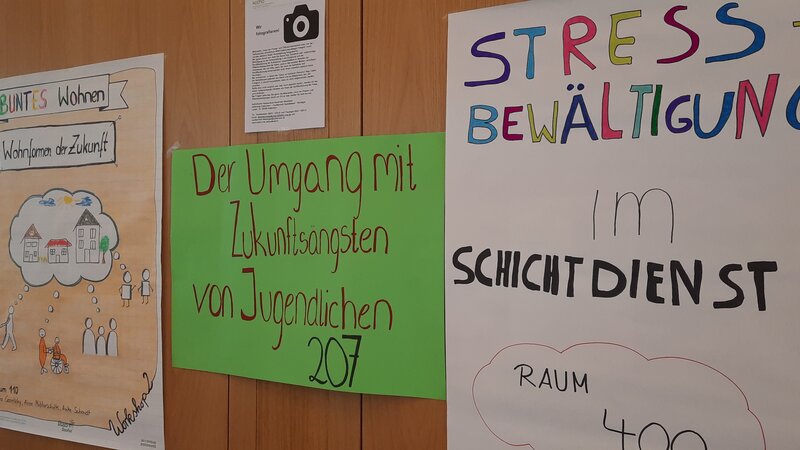 Ein weiterer Workshop beschäftigte sich mit dem Thema „Stressbewältigung im Schichtdienst“. Hintergrund ist die eigene Erfahrung der Arbeit im Schichtdienst im SOS-Kinderdorf Lippe, im Mutter-Kind-Haus KIM Soziale Arbeit, in der Kinderintensivwohngruppe Haus Sterntaler von Let’s Go sowie der Noah Wohnstätte Lippstadt. „Im Workshop mit dann 9 Personen aus unterschiedlichen Einrichtungen sind wir schnell ins Gespräch und hinein ins Thema gekommen“ – so die Rückmeldung der Studierenden. „Wir konnten feststellen, dass unser Thema überall einen hohen Stellenwert hat, sowohl in Bezug auf das berufliche Umfeld und die Zusammenarbeit unter Mitarbeitenden, als auch auf die persönliche Ebene und das Wohlbefinden der eigenen Person bezogen. In der Kritikphase haben wir die hohe Arbeitsverdichtung, ständige Erreichbarkeit über Messenger-Dienste notiert. Visionär schienen institutionelle Rahmenfaktoren wie Supervision und rechtliche Vorgaben, aber auch z.B. das kostenlose Abo im Fitnessstudio oder geleaste E-Bikes für Mitarbeitende, um die Gesundheit zu fördern. Auf der persönlichen Ebene stand Selbstfürsorge und Achtsamkeitstraining im Vordergrund. Unser Blick ging darauf, was in jeder Einrichtung umsetzbar wäre und was weniger möglich erscheint. So erscheint die an manchen Orten etablierte Mitarbeiter:innenfeier oder der Betriebsausflug aufgrund von Fachkraftmangel nicht in jeder Einrichtung umsetzbar zu sein und muss letztlich der Vision zugeordnet werden. Als wichtigstes Ziel erschien „Work-Life-Balance“, um Stress vorbeugen zu können. Deutlich wurde, dass beruflich und privaten Faktoren fest miteinander verbunden sind und nur ein ausgeglichenes Zusammenspiel eine Work-Life-Balance ermöglichen kann.“ – so die Praxisstudierenden im Fazit.