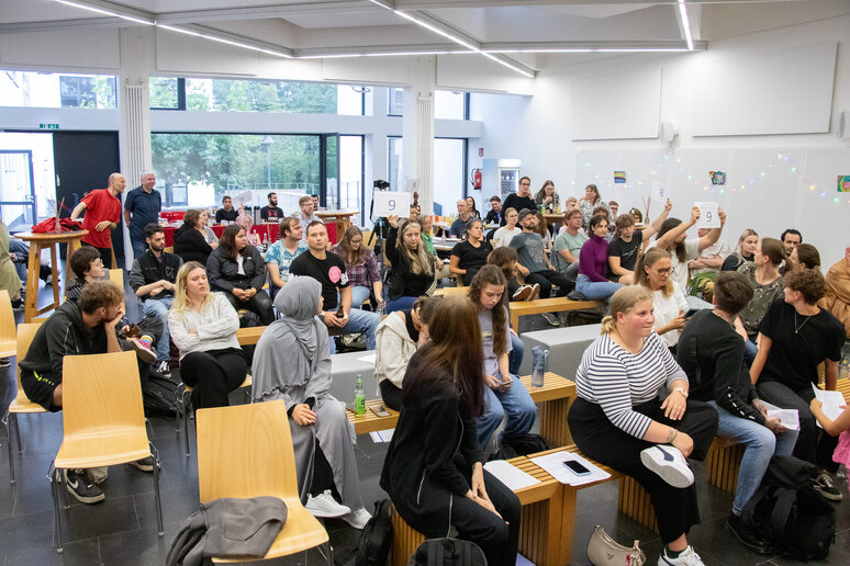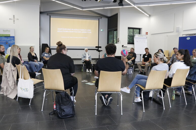 Bereits zum zweiten Mal fand der Fachtag „Theater und Soziale Arbeit“ in Zusammenarbeit von katho und ax-o e.V. statt. Als anerkannter Träger der freien Jugendhilfe macht es sich der Verein seit 2004 zur Aufgabe, Kinder und Jugendliche mit kulturpädagogischen Mitteln bei ihrer Identitätsentwicklung zu begleiten. In Form von Impulsvorträgen, einer Podiumsdiskussion mit Jugendlichen sowie praktischen Workshops beleuchtete der Fachtag das Phänomen Adultismus und dessen Auswirkungen auf die Theaterarbeit mit Heranwachsenden. Die Workshopleitungen Pauri Röwert und Thalia Schoeller resümieren: „Es war sehr wertvoll, sich mit Studierenden zum Thema Adultismus auszutauschen und zu merken, wie es uns alle betrifft. Im Workshop haben wir gemeinsam Ideen entwickelt, wie wir Begegnungen zwischen Kindern, Jugendlichen und Erwachsenen in unterschiedlichen Lebensbereichen anders gestalten können und freuen uns, wenn einige dieser Ideen umgesetzt werden.“