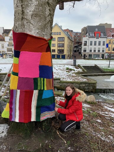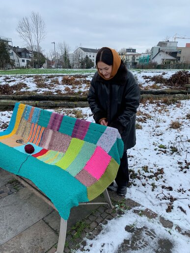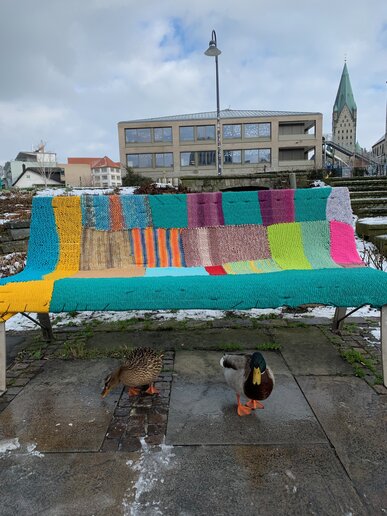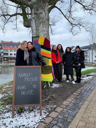 Parkbänke als Symbol für Gemeinschaft und Geselligkeit haben ein wärmendes Wollkleid bekommen. Ein Baum trägt temporär einen schützenden Gürtel aus Bio-Wolle: Lasst uns gemeinsam auf die Umwelt achten und gegen die Folgen des Klimawandels angehen - so die Botschaft der Kunst. Über 30 Menschen allen Alters haben mitgewirkt: Nachbar_innen, Kolleg_innen, Großeltern... einige haben extra stricken gelernt. Jedes Stück des textilen Flickenteppichs trägt eine eigene Handschrift. Die temporäre Kunstaktion hat Schaulustige und Interessierte angelockt. Die Studierenden und ihre Professorin Dr. Maren Ziese, die im Fachbereich Sozialwesen Kulturpädagogik lehrt, sind zufrieden: "Wir haben unser Ziel erreicht und konnten für zwei Stunden diesen winterlichen Ort mit Kunst aufwärmen, Gespräche aktivieren und Vorfreude auf den bunten Frühling wecken".