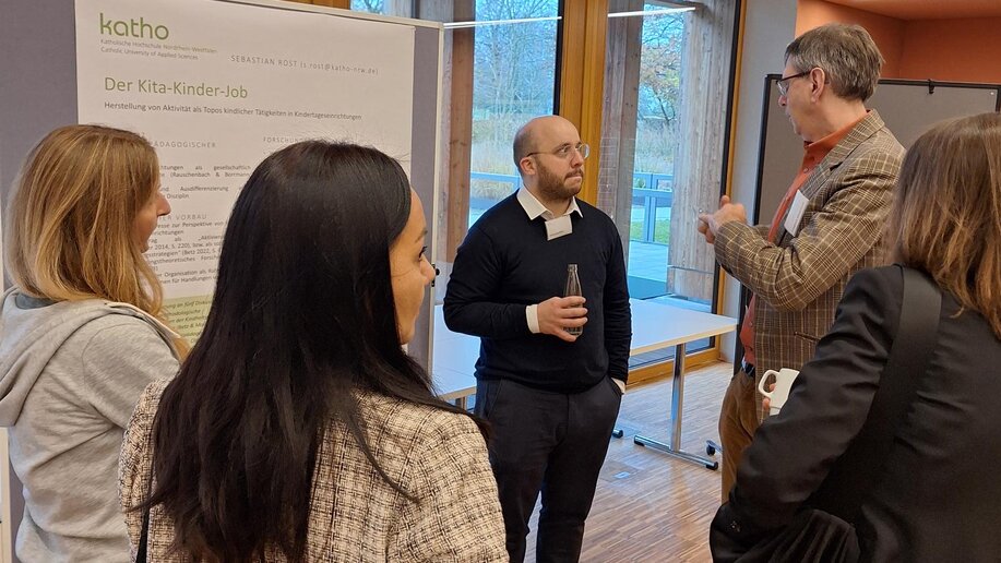 Bereits zum Mittagsimbiss konnten die Teilnehmenden die Forschungsposter der Promovierenden diskutieren. In der anschließenden „Poster-Session“ erklärten die Wissenschaftlichen Mitarbeitenden Sebastian Rost (Sozialwesen Paderborn), Franziska Sawitzki (Sozialwesen Köln), Monika Laumann (Sozialwesen Münster) und Lisa Kieselmann (Sozialwesen Paderborn) die Forschungsansätze ihrer Promotionsarbeiten. In anschließenden „Gallery Walk“ entstanden spannende Diskussionen zu den präsentierten Themen mit fruchtbarem Input von erfahrenen Kolleg_innen.