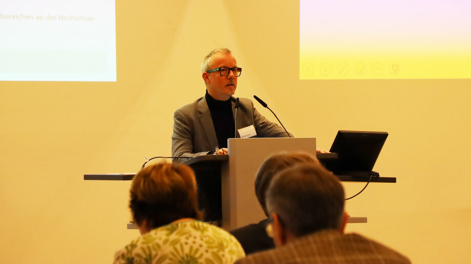 Nach einem herzlichen Willkommen der Teilnehmenden am diesjährigen „Tag der Forschung“ am katho-Standort Paderborn durch Bergit Peters (Dekanin für den Fachbereich Theologie) und Patrick Isele (Dekan für den Fachbereich Sozialwesen) nutzte Prorektor Michael Isfort die Gelegenheit, mit Blick auf die ernüchternden Wahlergebnisse in den USA auf die Freiheit der Forschung hinzuweisen: „Freie Forschung ist auch ein Stück Demokratie“, sagte Isfort im Audimax zu den über 50 Teilnehmenden. Forschung sei Wahrheit und Wirklichkeit auf dem Boden von klar definierten Methoden – und basiere nicht auf dahingeworfene Pseudofakten: „Dafür stehen wir alle an der katho“, sagte Isfort weiter, „das trägt uns als Gemeinschaft.“ Der Prodekan für Forschung und Transfer forderte die Forschenden dazu auf, diese Möglichkeiten weiterhin zu nutzen und Spaß zu haben – denn Erkenntnisgewinn, so Isfort, sei auch immer Lustgewinn: „Das Schönste ist doch, von den eigenen Daten überrascht zu werden“.