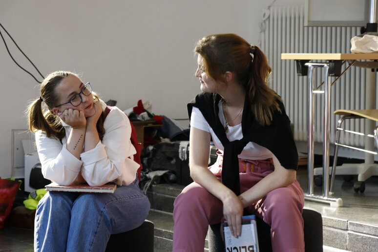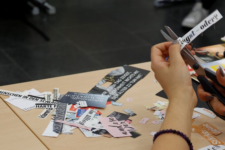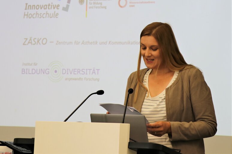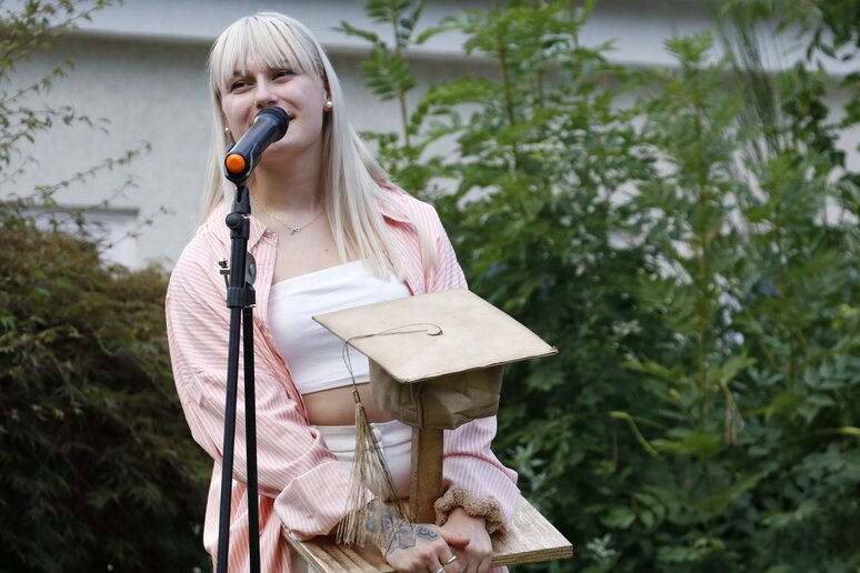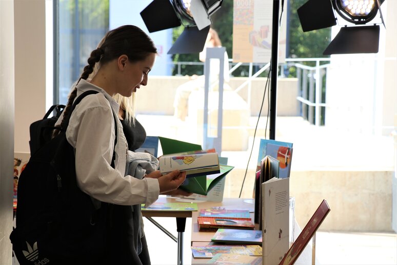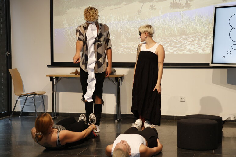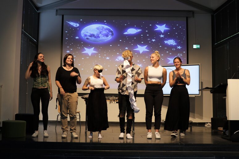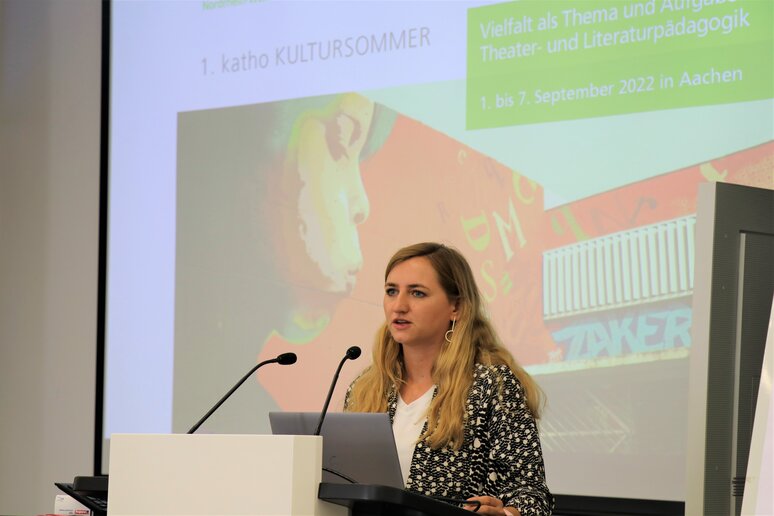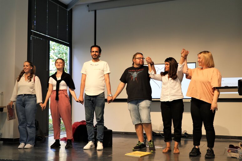Mit Sprache experimentierten in den folgenden Tagen sowohl die Teilnehmenden der Theater- als auch die Teilnehmenden der Literaturwerkstatt unter der Anleitung von Prof.in Nübel. Auf der Grundlage von Büchern aus der Ausstellung entstanden Inszenierungen, die in der Aula zur Aufführung kamen sowie Texte, die im Rahmen des Poetry Slams öffentlich präsentiert wurden. Der Poetry Slam, moderiert von katho-Student David Strzeminski, bildete ein Highlight zum Abschluss des Kultursommers. Neben Prof. Dr. Dominik Farrenberg stellten sich Studierende aller Jahrgänge aus Bachelor- und Masterstudiengang mit ihren Texten dem Votum der Publikumsjury. Zur Siegerin des ersten katho Poetry Slams wurde Carla Ganser aus dem Bachelorstudiengang gekürt.