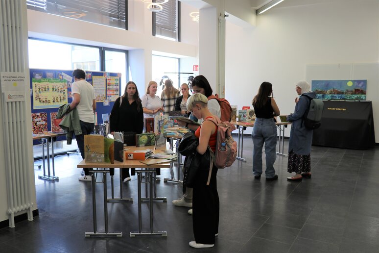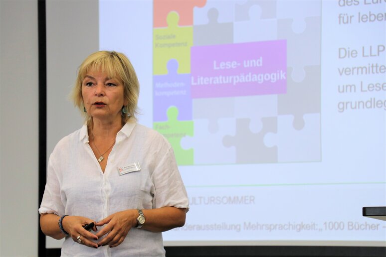 Manuela Hantschel, Diplom-Pädagogin und erste Vorsitzende des Bundesverbandes für Leseförderung e.V. (BVL), betonte in ihrem Wortbeitrag zur Eröffnung des Kultursommers und der Buchausstellung „1000 Bücher-1000 Sprachen“ die Bedeutung von Vielfalt in der Literatur für die Identitätsbildung von Kindern und Jugendlichen: „Wir brauchen Literatur, weil wir vielfältig sind. Wir sind keine kulturelle, ethnische, religiöse Einheit mehr. Daher brauchen wir transkulturelles Lernen, und Vielfalt in der Vernetzung untereinander.“ Dr. Marina-Rafaela Buch, Leiterin der Agentur für Transfer und Soziale Innovation (s_inn), ging in ihrem Grußwort auf die Rolle der Sprache als Medium für Verständnis wie Missverständnis ein und plädierte dafür, Mehrsprachigkeit als Ressource zu betrachten.