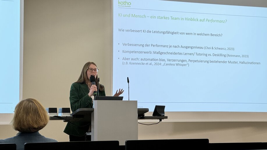 Ein interaktiver Austausch des Kollegiums und der Vortrag von Prof.in Dr.in Gesa Linnemann „Mensch und KI – ein starkes Team“ stimmten auf den inhaltlichen Schwerpunkt der Dienstbesprechung ein. Impulse und Diskussionen zu den vielfältigen Aspekten von KI in der Hochschule wurden in Workshops am zweiten Tag der Dienstbesprechung vertieft. Prorektorin Barbara Ortland wertete die vielfältigen Arbeitsergebnisse aus und definierte KI als Entwicklungsaufgabe, bei der sich die Kolleg_innen der Fachbereiche gut gegenseitig unterstützen können und sollten.