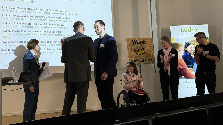 Die Rektorin dankte zudem allen katho-Angehörigen, die die Hochschule jeden Tag weiterentwickeln, und lud alle zum Dialog ein: „Wir wollen keine Mauern bauen, sondern Windmühlen!“ Dem sind Prof. Dr. Sebastian Laukötter und Prof.in Dr.in Isabelle-Christine Panreck gefolgt und haben einen „Tag der Lehre“ konzipiert, der am 13. Juni 2025 erstmals am Standort Münster stattfinden wird.