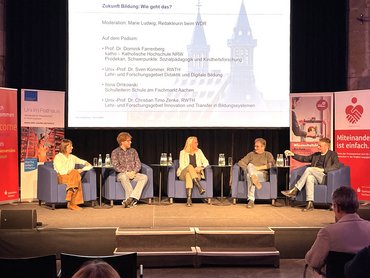 Auf dem Podium vertreten waren Prof. Dr. Christian Timo Zenke (Lehr- und Forschungsgebiet Innovation und Transfer in Bildungssystemen, RWTH Aachen) sowie Prof. Dr. Sven Kommer (Lehr- und Forschungsgebiet Didaktik und Digitale Bildung, RWTH Aachen). Die Katholische Hochschule Nordrhein-Westfalen (katho) wurde durch Prof. Dr. Dominik Farrenberg, dessen Forschungsschwerpunkte in den Bereichen Sozialpädagogik und Kindheitsforschung liegen, repräsentiert. Komplettiert wurde die Runde durch Ilona Orlikowski, Schulleiterin der Grundschule am Aachener Fischmarkt.