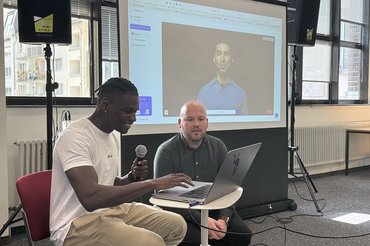 Ein Student (links im Bild) übernimmt die Rolle des Beraters, angeleitet von Marvin Hackfort (DLSC-Team); im Hintergrund der Avatar „Felix“.