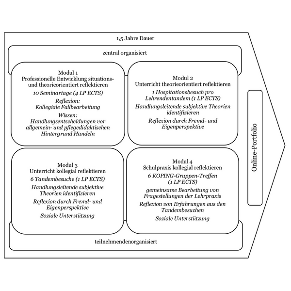 Die Weiterbildung beinhaltet vier Module mit je spezifischen Arbeitsformen. Inhaltlich werden erfahrungsbezogene Fälle in den Vordergrund gestellt, mit denen Reflexion und Wissenstransfer ermöglicht werden. Im Modul 1 erfolgt an zehn Seminartagen ein gemeinsames kasuistisches Arbeiten. Die Teilnehmenden bilden Lehrendentandems, die ihren Unterricht bei sechs Arbeitstreffen kollegial hospitieren und reflektieren (Modul 3). Professoren der Pflegepädagogik und Erziehungswissenschaft besuchen die Lehrendentandems für eine Unterrichtshospitation und eine ergänzende theorieorientierte Reflexion des gemeinsam erlebten Unterrichts (Modul 2). Zwei Lehrendentandems bilden jeweils eine sog. KOPING-Gruppe, die in sechs Arbeitstreffen gemeinsame Fragestellungen der Lehrpraxis bearbeitet (Modul 4).